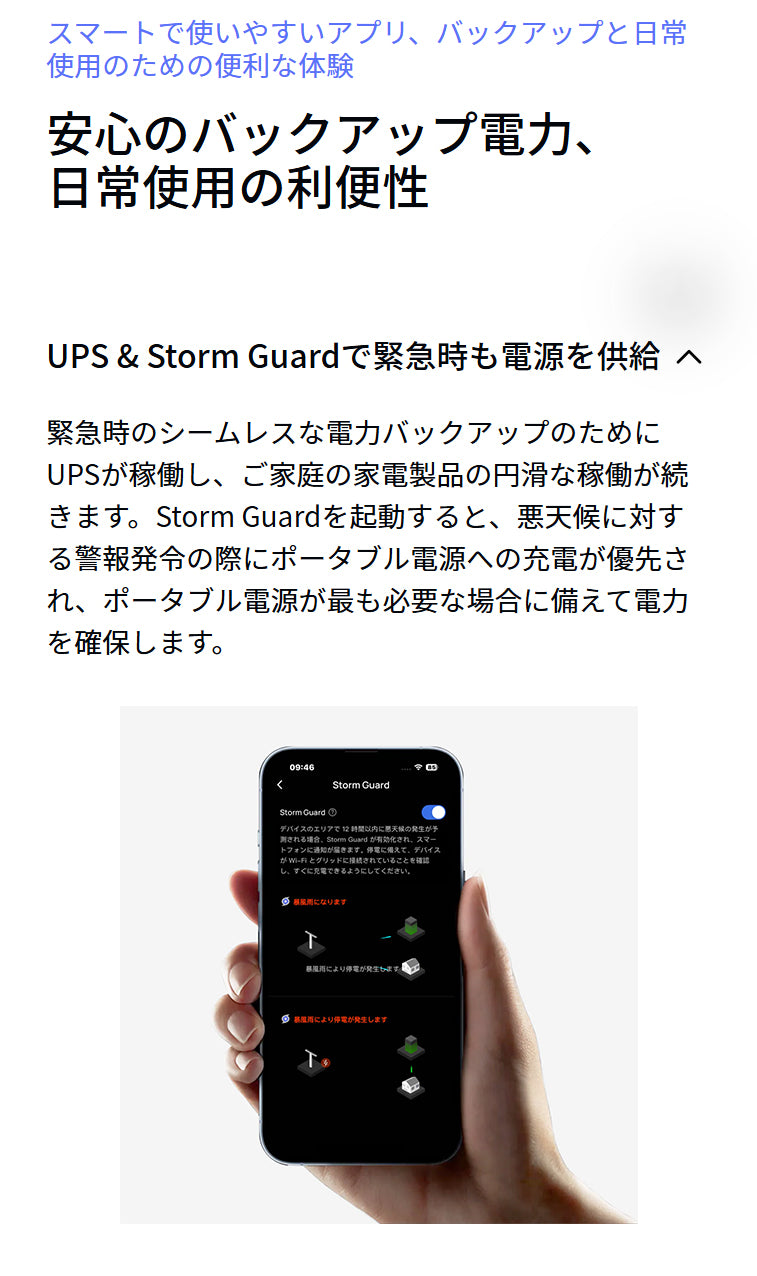 ・AC入力の場合、56分で100%充電/1900W X-Boost、99%の家電製品をサポート/10年の寿命、次世代LFPバッテリー/600W以下の稼働でわずか30dBの作動音。